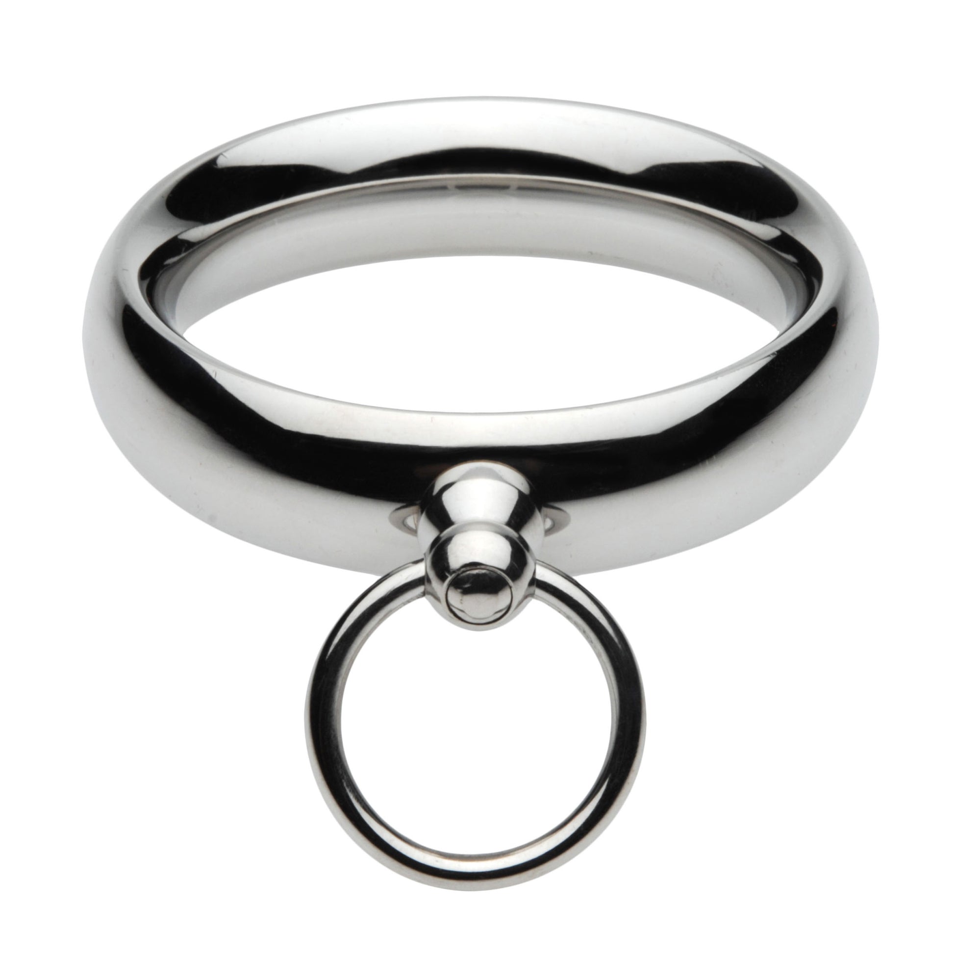 This versatile cock ring is a heavyweight way to enjoy erection enhancement while adding style and functionality! The O-ring at the front will set the mood as a statement piece, or act as a versatile anchor point for ropes, chains, clamps, or other bondage accessories. Get creative! Chain them to the wall or force them to bend over in supplication to you. The smooth, weighty steel is temperature sensitive and can be heated up or cooled down as you desire.